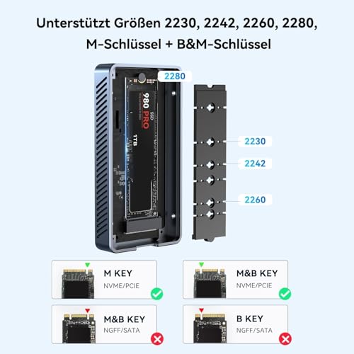 | Features | JHL7440 Intel Der beglaubigte chip: Eine doppelschipser-steuerung, stabiler,langlebiger, hitzeserfassung ist besser mit thunderbolt 4/3, USB 4/3/2 vereinbar. Anmerkung: Es ist nur ein m2 ssd gehäuse und kein SSD, Blitzschnelle 40Gbps:Unter Verwendung des Intel JHL7440 High-End-Hauptsteuerchips unterstützt nvme-Gehäuse ultrahohe Geschwindigkeiten bis zu 40Gbps, Geschwindigkeitstest mit Samsung 980 EVO Plus auf Macbook Pro, Lese- und Schreibgeschwindigkeit erreicht bis zu 2800MB/s und 2500MB/s. (Wenn Ihre SSD das NVMe-Protokoll nicht unterstützt, überschreitet die Geschwindigkeit nicht 600MB/s.), Kleiner und tragbarer:Die Größe des externen Festplattengehäuses aus Aluminium ist 104*54*16MM, klein, exquisit und einfach zu tragen, was dieses M.2 nvme Gehäuse zu einem guten Arbeits- und Lebenspartner macht. Ausgestattet mit 40gbps Datenkabel, lassen Sie eine super Hochgeschwindigkeitserfahrung jederzeit haben, Ausgezeichnete Wärmeableitung:Befestigen Sie das Thermopad auf der SSD für optimalen Kontakt mit der Aluminiumlegierungsschale, um Wärme effektiver und schneller abzuleiten, um einen besseren Schutz der SSD zu gewährleisten, Umfangreiche Kompatibilität:ACASIS M.2 NVMe SSD Gehäuse eingebauter Intel JHL7440 Chip, nimmt Dual-Chip Master Steuerung an, ausgestattet mit 40Gbps Typ-C Schnittstelle. Das NVMe Gehäuse kompatibel mit Thunderbolt 4/3,USB 4/3.2/3.1/3.0/2.0 bei entsprechenden Geschwindigkeitsbegrenzungen, um eine Vielzahl von Arbeit und täglichen Anforderungen zu erfüllen |