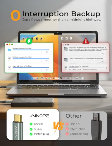Das AINOPE Kabel zeigt seine Stärke in der Datenübertragungsgeschwindigkeit. Mit einer Unterstützung von bis zu 10 Gbit/s ist es wesentlich schneller als herkömmliche USB 3.0-Kabel. Diese hohe Geschwindigkeit macht es ideal für große Datenmengen, wie HD-Filme oder umfangreiche Projektdateien.