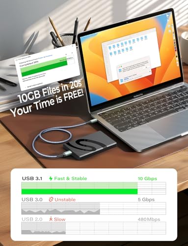 Perfekt für schnelle Datenübertragungen: Mit einer Geschwindigkeit von 10 Gbit/s überträgst du 10 GB in nur 20 Sekunden. Das robuste, geflochtene Nylonkabel bietet Haltbarkeit und universelle Kompatibilität mit Festplatten und Smartphones. Ideal für effizientes Arbeiten.