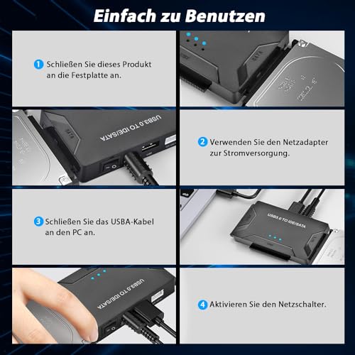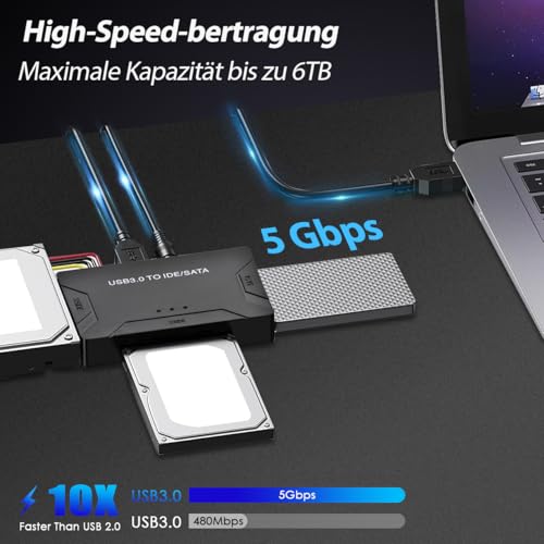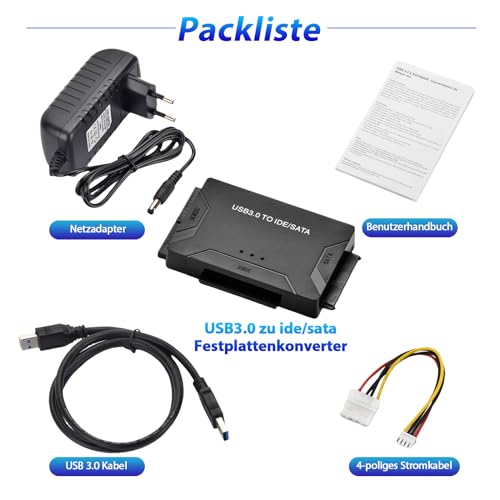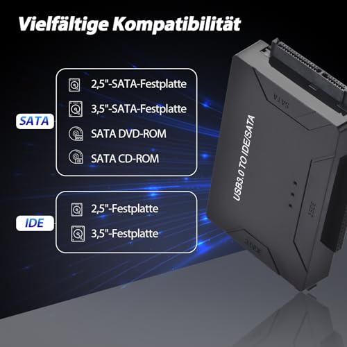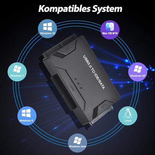 | Features | 【Große Kompatibilität】Unser USB zu IDE/SATA festplatten adapter unterstützt verschiedene Arten von Speichergeräten, einschließlich 2,5-Zoll und 3,5-Zoll SATA Festplatten, 2,5-Zoll SATA SSDs und 2,5-Zoll und 3,5-Zoll IDE Festplatten. Es gibt auch ATA/ATAPI, DVD-R/RW, CD-ROM/CD-RW, serielle Festplatten, IDE Parallelport Laufwerke und mehr, um Ihre verschiedenen Speicheranforderungen zu erfüllen., 【Unterstützung für große Kapazität】Dieser USB SATA Adapter Konverter unterstützt nicht nur eine maximale Festplattenkapazität von 6TB, sondern kann auch drei Festplatten gleichzeitig anschließen, einschließlich einer 2.5 "IDE", einer 3.5" IDE und einem 2.5 "/3.5" SATA. Ausgestattet mit einer Festplatte Docking Station, die Ihnen mehr Speicherplatz bietet., 【Ultra hohe Übertragungsgeschwindigkeit】USB SATA adapter ausgestattet mit USB 3.0 Schnittstelle, kann die Übertragungsgeschwindigkeit bis zu 10-mal die 5 Gbps erreichen, die schnell große Datenmengen übertragen und Ihre Arbeitseffizienz verbessern kann. Gleichzeitig unterstützt es auch USB 2.0/1.0, wodurch Kompatibilität auf verschiedenen Geräten gewährleistet ist, sodass Sie sich keine Sorgen über Verbindungsprobleme machen müssen., 【Einfach zu bedienen】Die Bedienung ist einfach und bequem, unterstützt mehrere Systeme wie Windows 10/8/7/XP/Vista, Mac OS, Linux, etc., ohne die Notwendigkeit komplexer Einstellungen oder Treiber. Es kann durch Einfügen erkannt und schnell verwendet werden., 【Tragbares Design】Exquisites Mini-Design, einfach zu tragen, passt leicht in Taschen, Rucksäcke oder Reisetaschen. Ob zu Hause oder im Büro, es nimmt nicht zu viel Platz auf dem Schreibtisch ein und bietet bequeme Speicherlösungen für Sie jederzeit und überall. |