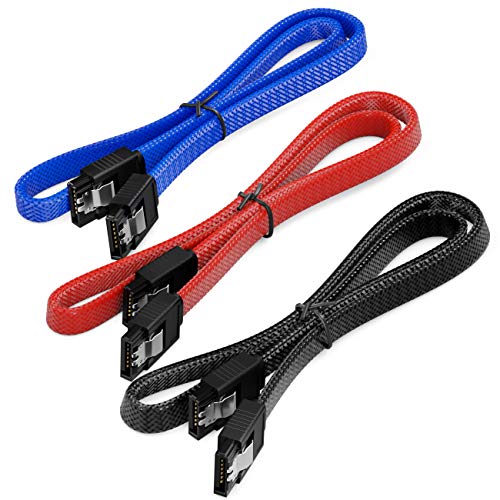 deleyCON Nylon SATA III Kabel Set (Serial AT Attachment) // Bis zu 6 Gbit/s Übertragung, Anschluss: 7-Pin SATA Stecker gerade zu 7-Pin SATA Stecker gerade // Abwärtskompatibel zu SATA I (S-ATA I), SATA II (S-ATA II), Genormte, passgenaue S-ATA-Stecker // Kompatibel mit allen Geräten, die über einen S-ATA-Anschluss verfügen, einschließlich Festplatten, HDDs, SSDs, CD-, DVD-, BluRay-Laufwerken und -Brennern, SATA-Bandlaufwerken, Speicherkartenlesegeräten usw., SATA Stecker mit Verriegelung // Einfaches Verlegen im PC Computer Gehäuse, Lieferumfang: SATA 3 Datenkabel Anschlusskabel, Farbe: Schwarz Rot Blau // Länge: 50 Zentimeter // Anzahl: 3 Stück als Set, Modellnummer: MK4202 // Marke: deleyCON