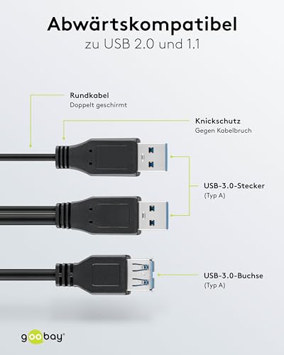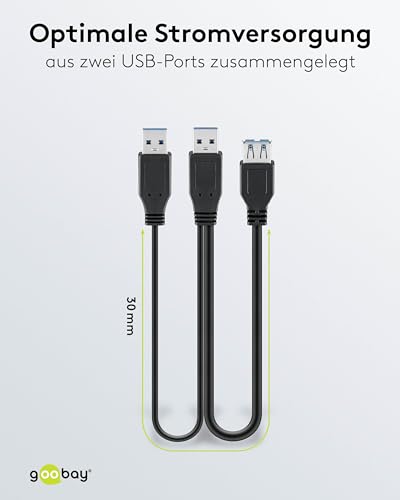 USB Kabel mit 2x USB 3.0 Stecker auf 1x USB 3.0 Buchse (Typ A) und 5 Gbit/s SuperSpeed Datenübertragung; USB 3.0 Kabel ist 10x schneller als USB 2.0; Abwärtskompatibel zu USB 2.0 / USB 1.1, Y USB Kabel zum Einspeisen der Leistung von zwei USB Ports für energieintensive Geräte wie externe Festplatten 2,5" SSD / HDD mit Stromversorgung über USB Typ A Buchse, UL-zertifiziertes Y Kabel in Premium Qualität; UL Zertifizierung für garantierte Sicherheit; Doppelte Schirmung filtert Störungen von außen & durch die Datenübertragung entstehende Strahlung, Mit diesem Dual USB Splitterkabel können bequem Geräte mit Strom versorgt werden; Zum Anschluss von zwei USB Geräten wie Tastatur / PC / externe Festplatte / Laptop / Kamera, Das 30 cm lange doppel USB Kabel hat einen strapazierfähigen PVC Kabelmantel, der den USB Splitter vor Beschädigungen und Kabelbruch schützt; AWG 28; Goobay Einfach Alles Passend