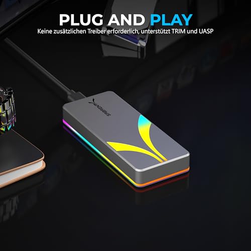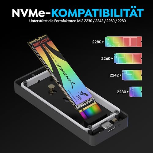 Das SABRENT Rocket RGB USB C 20Gbps M.2 SATA NVMe SSD Gehäuse bietet eine beeindruckende Kombination von Geschwindigkeit, Vielseitigkeit und Design. Dieses Produkt richtet sich vor allem an Technik-Enthusiasten und professionelle Anwender, die auf der Suche nach einer leistungsstarken und ästhetischen Lösung zur Erweiterung ihrer Speicherkapazität sind. Mit seiner Kapazität zur Unterstützung von sowohl M.2 SATA als auch NVMe SSDs stellt es eine flexible und zukunftssichere Option dar.