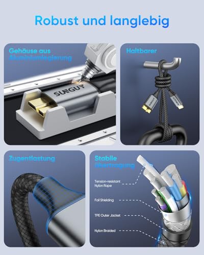 Mit einer maximalen Datenübertragungsgeschwindigkeit von bis zu 10Gbps zeigt das SUNGUY Kabel beeindruckende Leistungen, insbesondere beim Arbeiten mit SSDs. Es ist ideal, um große Dateien mühelos zu übertragen, was sowohl für den persönlichen als auch für den beruflichen Gebrauch nützlich ist.