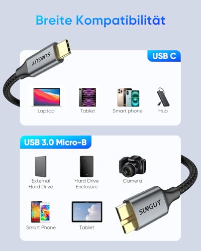 Die Kompatibilität des SUNGUY Kabels umfasst zahlreiche Geräte, darunter externe Festplatten von Western Digital, Samsung und Toshiba. Diese breite Unterstützung macht es zu einem vielseitigen Begleiter für diverse Anforderungen.
