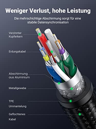 Die Verarbeitung des UGREEN Kabels ist erstklassig. Eine Nylonummantelung und ein Aluminiumgehäuse sorgen für Schutz und Langlebigkeit. Die vergoldeten Stecker verbessern die Signalqualität und verhindern Korrosion, was eine lange Lebensdauer gewährleistet.