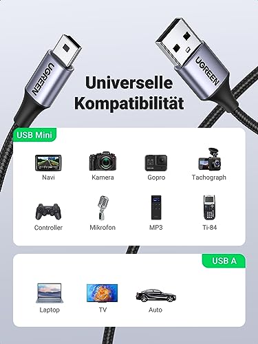 Verbinde deine Mini-USB-Geräte schnell und zuverlässig mit dem UGREEN USB-Kabel. Es unterstützt schnelles Laden und Datenübertragung, ist robust dank Nylonummantelung und Aluminiumgehäuse – ideal für PS3-Controller, externe Festplatten und mehr. Perfekte Verbindung für 9,99 €.