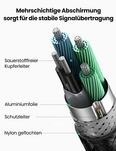 Die robuste Konstruktion des UGREEN Kabels fällt sofort ins Auge. Die Nylonummantelung und das Aluminiumgehäuse bieten eine hervorragende Haltbarkeit, die vor täglichen Beanspruchungen, Kabelbrüchen und Wackelkontakten schützt. Es ist auf Langlebigkeit ausgelegt, was auf lange Sicht eine kluge Investition darstellt.