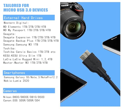 | Features | USB A 3.0 auf Micro 3.0 Kabel: USB 3.0 Typ A auf Micro-B Kabel, verbindet eine tragbare externe USB 3.0 Festplatte mit einem Computer für schnellen Datentransfer oder Synchronisation und lädt Samsung Smartphones oder Tablets mit USB 3.0 Micro-B Anschluss auf., Schnelle Übertragung und Synchronisierung: USB 3.0 Micro B Kabel überträgt bis zu 5 Gbit/s. Dieses Produkt kann hochauflösende Filme in Sekunden übertragen und Ihnen helfen, viel wertvolle Zeit zu sparen, indem Sie Dateien von Ihrem Computer auf eine externe Festplatte oder einen USB-3.0-Hub schnell übertragen., Mehrere Abschirmungen und Haltbarkeit: Vernickelte Stecker, blanke Kupferleiter, und die Kombination aus Aluminiumfolie und geflochtenen Abschirmungen bieten hervorragende USB-3.0-Kabelleistung, fehlerfreie Datenübertragung und schnelle Ladegeschwindigkeit; der geformte Zugentlastungsstecker ist langlebig. Die Grifffläche ist einfach einzuführen und herauszuziehen., Breites Anwendungsspektrum: Micro-USB 3.0-Kabel sind auch abwärtskompatibel mit USB 2.0 und USB 1.1 Ports von Computern – diese Kabel ermöglichen auch den Anschluss von USB 3.0 Geräten an ältere USB 2.0 Computern., Universelle Kompatibilität: Kompatibel für Samsung Galaxy S5, Note 3, Note Pro 12.2, Tab Pro 12.2, Pentax Kamera, USB-Hub und externe Festplatte wie Toshiba Canvio, Seagate FreeAgent, Western Digital (WD) My Passport und Elements Festplatte. |