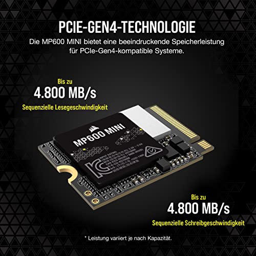 | Features | Schlanker M.2 2230-Formfaktor: Vollständig kompatibel mit Valve Steam Deck, Microsoft Surface und anderen ultradünnen Geräten – ein großartiges Upgrade für kompatible Maschinen., Enorme Gen4-Speicherleistung: Ein PCIe Gen4 x4-Controller bietet eine sequenzielle Lesegeschwindigkeit von bis zu 4.800 MB/s und eine sequenzielle Schreibgeschwindigkeit bis 4.800 MB/s sowie schnellen Zugriff., Beschleunigung Ihres PCs: Beim Laden von Spielen, Hochfahren von Windows sowie Öffnen und Übertragen von Dateien waren Sie noch nie schneller unterwegs., Gen4 PCIe x4 NVMe 1.4 M.2-Hochgeschwindigkeitsschnittstelle: Die mit Gen4 PCIe-Technologie für maximale Bandbreite ausgestattete MP600 MINI besticht durch hervorragende Speicherleistung., Rückwärtskompatibel*: Automatische Unterstützung für PCIe Gen3-Systeme. *Reduzierte Leistung bei PCIe Gen3. |