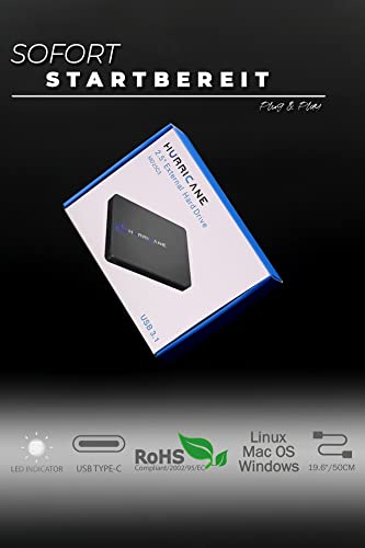| Features | Schnelle Datenübertragung: Die Hurricane externe Festplatte ist mit einer leistungsstarken USB-C-Schnittstelle ausgestattet, die superschnelle Datenübertragungsgeschwindigkeiten von bis zu 10 Gbit pro Sekunde ermöglicht. Damit können Sie Ihre Dateien und Daten blitzschnell übertragen und verwalten., Robust und stilvoll: Diese externe Festplatte beeindruckt mit einem modernen und eleganten Design. Die Aluminiumoberfläche dient nicht nur der Ästhetik, sondern sorgt auch für eine hervorragende Wärmeableitung, was die Langlebigkeit und Leistungsfähigkeit der Festplatte erhöht. Somit sind Ihre Daten optimal geschützt., Umfangreiche Kompatibilität: Diese externe Festplatte ermöglicht "Plug-and-Play", ohne dass Software installiert werden muss. Sie funktioniert reibungslos mit Windows, Mac, Linux, Smart TVs, PS4, PS5 und Xbox, was sie äußerst vielseitig macht., Leistungsstark und zuverlässig: Leistungsstark und zuverlässig: Diese externe Festplatte gewährleistet sichere Datenübertragungen und bietet ausreichend Speicherplatz für Ihre wertvollen Fotos, Videos und TV-Aufnahmen., Im Lieferumfang enthalten: Hurricane tragbare externe HDD mit 1 TB Kapazität im 2,5-Zoll-Format, ein praktisches USB-C-Kabel für schnelle Verbindungen und eine Bedienungsanleitung, |