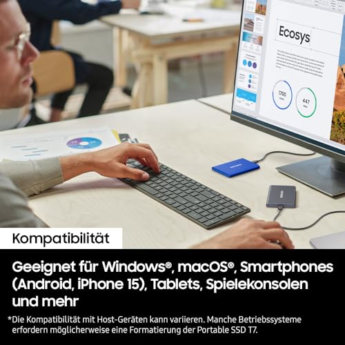 Die Samsung Portable SSD T7 ist äußerst benutzerfreundlich. Die Installation erfordert keine zusätzlichen Treiber, und ihr Plug-and-Play-Design ermöglicht es, sofort mit der Nutzung zu beginnen, egal ob auf einem PC, Mac oder mobilen Endgerät.