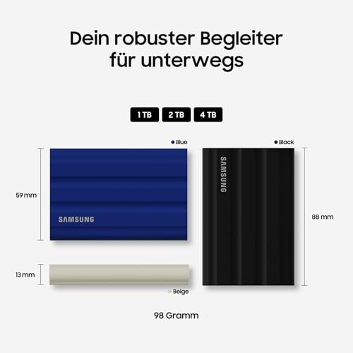 | Features | Die robuste Samsung T7 Shield ist wasser- und staubfest (zertifiziert nach Industriestandard IP65), eignet sich hervorragend für Outdoor-Aktivitäten und ist stoßfest bis zu 3 m Fallhöhe, Externe SSD speichert ideal Inhalte aus Foto und Video, er ist kompatibel mit dem PC und Mac sowie Smartphones (u.a. iPhone 15), Tablets, Smart-TVs und Spielekonsolen über die Anschlüsse USB Typ-C und Typ-A, Dank USB 3.2 Gen. 2 ist die Portable SSD mit 1.050 MB/s Datenübertragungsrate 9,5 Mal schneller als externe Festplatten, Das kompakte Gummigehäuse zeichnet sich durch geringe Hitzeleitfähigkeit und einem enormen 1TB/2TB Highspeed Speicher aus, Samsung T7 Shield bietet einen optionalen Passwortschutz auf Basis der AES 256-Bit Hardwareverschlüsselung und Performance-Optimierung mit der kostenlosen Samsung Magician Software, Die kostenlose Samsung Magician Software optimiert für Sie die Leistungsfähigkeit und hält das Laufwerk mit Updates immer auf dem neuesten Stand |