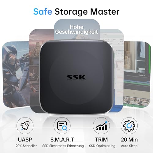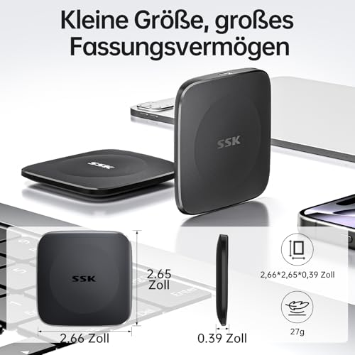| Features | Externes SSD-Laufwerk mit 2 in 1 USB-C-Kabel: Ausgestattet mit 2 in 1 USB-C und USB-A Kabel, SSK USB SSD Solid State Drive ermöglicht es Ihnen, Daten zwischen Smartphone/Tablet und Computer bequem zu übertragen. Geben Sie sofort Speicherplatz frei oder verschieben Sie schnell Bilder oder Filme auf Ihrem OTG-fähigen Android-Typ-C-Handy, Tablet, Windows-Computer, Smart-TV und mehr., Hohe Übertragungsrate: Tragbares SSD-Laufwerk mit einer Lesegeschwindigkeit von bis zu 550 MB/s und einer Schreibgeschwindigkeit von bis zu 500 MB/s, d.h. 10-mal schneller als herkömmliche USB 2.0-Laufwerke und Speichersticks, damit Sie hochauflösende Fotos, Videos und Dateien mit großer Kapazität schneller übertragen können. Master SSD externes Laufwerk Gesundheit mit S.M.A.R.T. Überwachung. Die TRIM-Technologie sorgt für konstante Schreibzeiten und verlängert die Langlebigkeit der Festplatte., Plug and Play : SSK ssd externe Festplatte unterstützt Plug and Play, ohne Software-Installation.USB Solid State externe Festplatte kann die Kapazität von Telefonen und Computern, die Ihnen helfen, genügend Kapazität zu erweitern.Es ist bequem für jedermann, um das Mobiltelefon zu verwenden, um direkt lesen Sie die SSD-Daumen-Laufwerk für die gemeinsame Nutzung von Dateien, Datenübertragung und Video-Wiedergabe bei der Arbeit oder Studium, Tragbar & leichtes Gewicht: Sie können dieses externe USB-SSD-Laufwerk überallhin mitnehmen, was Ihr Leben einfacher macht.SSK externe Solid State Drives wiegt nur 27g und misst 2,66*2,65*0,39 Zoll. Fortgeschrittenes tragbares USB-SSD-Laufwerk für Unternehmen kann Ihr Leben und Ihre Arbeit zu jeder Zeit aufzeichnen, Universelle Kompatibilität: Externer Hochgeschwindigkeitsspeicher, kompatibel mit Computergeräten, Smartphones, iPhone 15, iPad, xBOX, Laptops, Macbook u.v.m. Tragbare Festplatte funktioniert mit den meisten Systemen wie Windows、macOS、Linux、Android、iPadOS/Android (nicht kompatibel mit Lightning-Anschluss) |