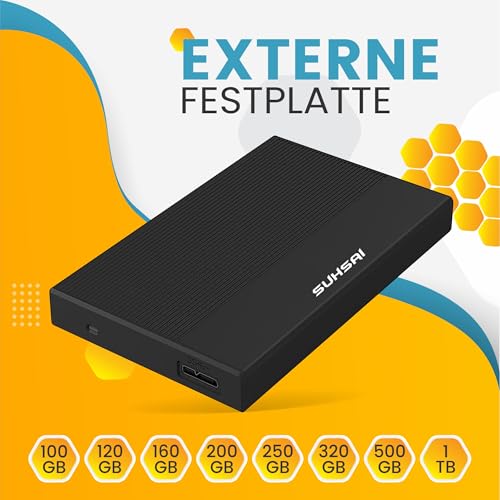 Externe Festplatte – Mit der tragbaren Festplatte von SUHSAI können Sie Filme, Musik und Bilder unterwegs genießen. Die externe Festplatte 3.0 USB mit schlankem Design verfügt über mehrere Größen zur Auswahl von 100 GB bis 1 TB und bietet Ihnen alles, was Sie zum Speichern Ihrer Daten und Multimedia benötigen., Externe Datenspeicherung – Genießen Sie jetzt die Freiheit, offizielle Daten, studentische Projektarbeiten und Datensicherungen überall hin mitzunehmen. Mit der tragbaren externen Festplatte können Sie Daten bis zu 1 TB sichern, so viele Dateien wie PPT, XLS, TXT, XLSX, PDF, HTML, DOC und viele mehr speichern., Universelle Kompatibilität – Die tragbare externe Festplatte unterstützt das Speichern und Sichern der gesamten Sammlung von Bildern, Bildern, Musik, Filmen, Videos und vielem mehr. Auf der externen Festplatte können Multimediadateien wie AVI, MOV, FLV, MP4, MPEG, Musikdateien MP3, WAV, CAF, AIFF, Bilder wie JPG, JPEG, PNG, GIF und viele mehr gespeichert werden. Nehmen Sie Ihre wertvolle Multimedia-Sammlung ganz einfach überallhin mit und genießen Sie sie überall., Schlankes und robustes Design: Das Gehäuse aus Aluminiumlegierung sorgt für zusätzliche Stabilität und schützt die Festplatte, bessere Wärmeableitung durch Wabendesign. Metallgehäuse mit schlankem Design passt perfekt zu Smart TV, Laptop, PC, Mac. Tragbare externe Festplatte unterstützt Windows, Linux, Mac. Die externe Festplatte von SUHSAI kann mit mehreren Geräten wie PC, Laptop, MAC, Smart Tv, Tablet verbunden werden., Lieferumfang: SUHSAI bietet ein Jahr, ist stolz auf seine hochwertigen Produkte und stellt sicher, dass keiner unserer Kunden Probleme damit hat. Wir sind immer für Sie da, um Ihnen zu helfen und jedes Problem zu lösen. 1 x Festplatte, 1 x USB 3.0-Kabel, 1 x Tasche