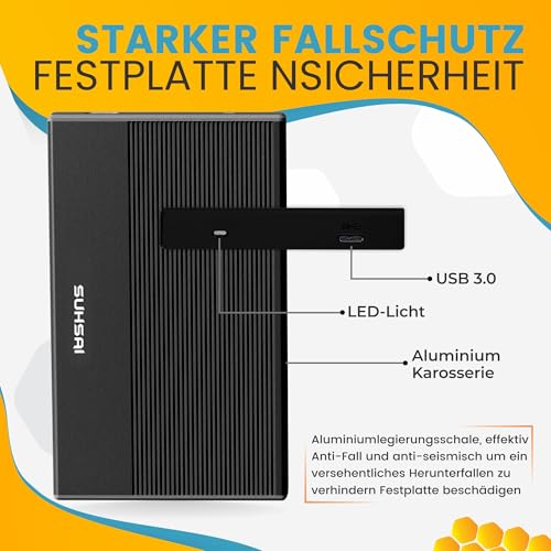 Die externe Festplatte SUHSAI ist ein zuverlässiges Speichermedium für all diejenigen, die ihre Daten sicher und bequem transportieren möchten. Mit ihrer hohen Speicherkapazität und universellen Kompatibilität bietet sie vielseitige Einsatzmöglichkeiten für unterschiedliche Bedürfnisse und Geräte.