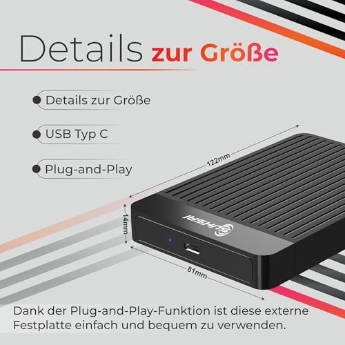 | Features | Breite Kompatibilität – Die externe 2,5-Zoll-HDD-Festplatte oder -Festplatte ist mit Windows, Mac, Linux und Android kompatibel. Die externe Suhsai-Festplatte kann an eine Vielzahl von Geräten wie PC, Laptop, MAC, Smart TV angeschlossen werden (stellen Sie sicher, dass Ihre TV hat einen USB-Anschluss) und Tablet. Es verbessert die Leistung durch blitzschnelle Datenübertragung. Wenn Ihre Festplatte betriebsbereit ist, leuchtet eine LED-Anzeige auf, um Sie zu benachrichtigen., Kompaktes und tragbares Design – Diese externe Festplatte oder USB-Festplatte ist klein und leicht, sodass Sie sie überall hin mitnehmen können. Sein schlanker, moderner Stil macht sich hervorragend auf Ihrem Schreibtisch oder in Ihrem Rucksack und ist aus hochwertigem ABS-Kunststoff gefertigt., Plug & Play – Schließen Sie das Laufwerk oder Speicherlaufwerk einfach an den Typ-C-Anschluss Ihres Computers an und verwenden Sie es sofort. Es müssen keine Treiber oder Software installiert werden. Diese externe Mac-Festplatte oder externe USB-Festplatte ist sofort einsatzbereit. Schließen Sie eine externe Festplatte an Ihren Gaming-PC, MAC, Gaming-Laptop oder Notebook-PC an, um viel Speicherplatz zu erhalten., Speicherkapazität – Mit 1TB bietet diese externe Festplatte, USB-Festplatte, externe USB-Festplatte viel Platz für all Ihre wichtigen Dokumente, Fotos, Videos und mehr. Machen Sie sich nie wieder Sorgen, dass Ihnen der Speicherplatz ausgeht!, Hochgeschwindigkeits- Übertragung – Mit Typ-C-Konnektivität kann this externe Festplatte Daten mit blitzschnellen Geschwindigkeiten übertragen, was sie zur perfekten Wahl für Profis und Ersteller von Inhalten macht, die große Dateien schnell verschieben müssen. Diese Laptop-Festplatte oder externe HDD USB 3.1-Version bietet Lese- und Schreibgeschwindigkeiten von bis zu 10 Gbit/s. |