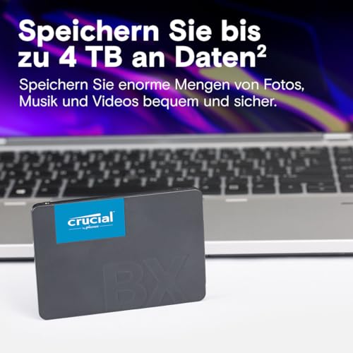 | Features | Ihr System in Sekundenschnelle hochfahren: Dateien fast augenblicklich laden und selbst anspruchsvolle Anwendungen mit der Crucial BX500 beschleunigen; die dynamische Schreibbeschleunigungstechnologie nutzt einen flexiblen Hochgeschwindigkeits Single-Level-Zellen Flash-Speicher, um rasante Geschwindigkeiten zu erzielen, Speichern Sie bis zu 4TB an Daten: Speichern Sie große Mengen an Fotos, Musik und Videos bequem und sicher; mit schnellem Zugriff auf Ihre Medien, Kreationen und Designs sind Sie bereit, diese mit maximaler Geschwindigkeit zu teilen, Upgrade mit Zuverlässigkeit: Unsere preisgekrönten SSD's werden durch Tausende von Validierungsstunden, Dutzende von Qualifikationstests und einer 3-jährigen beschränkten Garantie unterstützt, Vertrauen bei der Installation: Inklusive kostenloser Acronis True Image HD-Software für einfachste Datenmigration. Kompatibel mit dem Crucial Storage Executive Tool für eine einfache Wartung, Hardwarebasierte Verschlüsselung: Schützen Sie persönliche Dateien und vertrauliche Daten vor Hackern und Dieben mit 256 Bit AES-Verschlüsselung, die übliche Branchenstandards wie Microsoft eDrive, IEEE-1667 und TCG Opal 2.0 erfüllt |