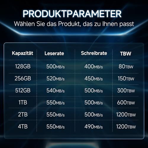 Auch beim Schreiben überzeugt sie mit Geschwindigkeiten von bis zu 500 MB/s, was das Laden von Anwendungen und Spielen beschleunigt. Dies macht sie ideal sowohl für den Heimgebrauch als auch für Profis.