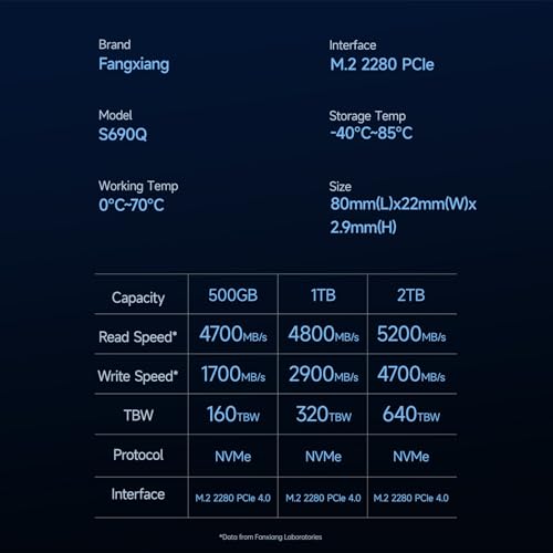 | Features | Superschneller: Lesegeschwindigkeit von bis zu 4,800 MB/s und Schreibgeschwindigkeit von bis zu 2,900 MB/s. Gesamtschreibkapazität von bis zu 320TB, Herausragende: Mit der HMB-Speicherpuffertechnologie und der intelligenten SLC-Cache-Beschleunigung bietet die SSD eine hervorragende Lese- und Schreibleistung, Breite Kompatibilität: M.2 2280 (80 x 22 x 3,5 mm), die eingebaute SSD ist mit Windows7, 8, 10, 11, Linux, Mac OS 10.9 und höher kompatibel. Kompatibel mit Laptops, Desktops und All-in-Ones (Computer-Motherboards müssen mit M.2-Schnittstellen ausgestattet sein), Energieeffizient: fanxiang S690Q SSDs verwenden hochwertige Partikel, um die Ladegeschwindigkeit und die Energieeffizienz des Geräts zu verbessern und die Latenzzeit von Betriebssystemen und Spielen/Software zu reduzieren, Langfristiger Service: Fanxiang ist bestrebt, globale Geschäftspartner mit qualitativ hochwertigen Produkten zu versorgen und bietet einen 3-Jahres-Garantieservice (Installationsschrauben und Schraubendreher sind im Produktpaket enthalten) |