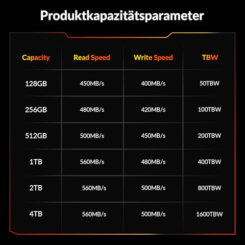 - Kapazität: 512GB mit einer Lesegeschwindigkeit von bis zu 500MB/s und Schreibgeschwindigkeit von bis zu 450MB/s