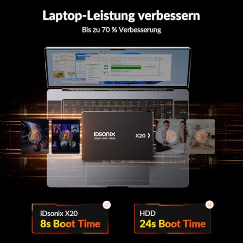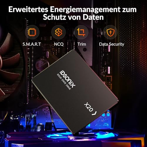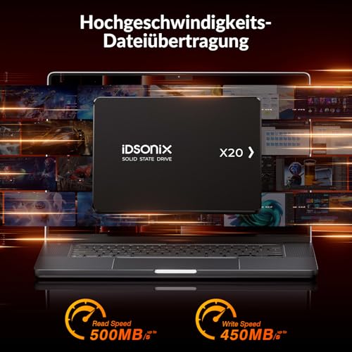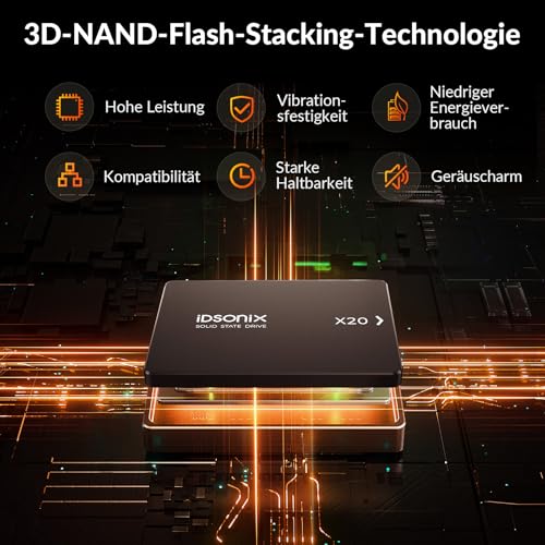 | Features | Überlegene Leistung : iDsonix SATA SSD Mit einer Lesegeschwindigkeit von bis zu 500MB/s und einer Schreibgeschwindigkeit von bis zu 450MB/s kann es die Leistung Ihres Laptops oder PC-Desktops erheblich verbessern und Ihre Wartezeit verkürzen., 3D NADA Flash : SSD festplatte intern Vorteile: Hohe Leistung, geringer Stromverbrauch, geringe Geräuschentwicklung, starke Haltbarkeit, starke Stoßfestigkeit, breite Kompatibilität, Erweitertes Energiemanagement : 2,5 zoll SSD Unterstützt SMART, NCQ, Trim und andere Funktionen, um Datenverlust nach einem anormalen Stromausfall zu vermeiden und Ihre wertvollen Daten gut zu schützen., Laptop- und PC-Upgrades : Die X20 SATA 2.5 SSD ist 5,6-mal leistungsstärker als herkömmliche Festplatten und kann die Laptop-Leistung um bis zu 70 % verbessern und die Startzeit des Computers erheblich verkürzen., 3 Jahre Garantie : Sie müssen sich keine Sorgen um die Qualität unserer Produkte machen, wir bieten Ihnen einen 3-Jahres-Garantieservice, nur Ersatz, aber keine Reparatur. |