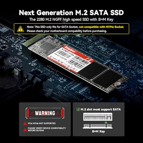 | Features | Schnelle M.2 SATA III SSD: Bis zu 580MB/s Lesegeschwindigkeit und 520MB/s Schreibgeschwindigkeit., Hohe Zuverlässigkeit: 3D NAND, S.M.A.R.T und TRIM-Technologie für lange Lebensdauer und Datensicherheit., Kompatibel mit gängigen Geräten: Funktioniert mit Lenovo, HP und Sony Laptops, nicht für MacBooks geeignet., Energiesparend & effizient: Reduzierter Stromverbrauch für längere Laptop-Batterielaufzeit und energieeffiziente Desktops., Einfache Installation: M.2 2280 Bauform für schnelle und unkomplizierte Systemaufrüstung. |
