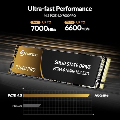 | Features | PCIe Gen 4×4 Hohe Leistung: Diese P7OOOPRO SSD 1TB verwendet die PCIe 4.0×4-Schnittstelle und das NVMe-Logo und bietet eine Lesegeschwindigkeit von bis zu 7000 MB/s, kombiniert mit QLC NAND-Flash-Speicher und hoher Schreibgeschwindigkeit (bis zu 6500 MB/s), wodurch sichergestellt wird, dass jeder Speichervorgang effizient und sicher ist., NVME SSD für Gaming: Diese Nvme M.2 1TB SSD wurde speziell für Hardcore-Gamer entwickelt und kann mit PS5 und DirectStorage verwendet werden. Mit dieser 1TB NVME SSD können Sie die Ladegeschwindigkeit von Spielen und Karten erheblich verbessern. Außerdem können Sie damit Raytracing bei HD 4K 120 Hz und dem höchsten Anzeigeeffekt einschalten und ein reibungsloses Spielerlebnis genießen., Stabile Leistung: Vollständig solides Design, keine beweglichen Teile, mit hervorragender Vibrations- (20 G) und Stoßfestigkeit (1500 G bei 0,5 ms), geeignet für den Einsatz in anspruchsvollen Gaming-Umgebungen, unterstützt erweiterte Funktionen wie SMART, NCQ, Trim usw., um die Sicherheit und Stabilität der Spieldaten zu gewährleisten, PHIXERO P7000 PRO M.2 Interne SSD: Die PHIXERO P7OOOPRO SSD-Serie bietet eine Vielzahl von Kapazitätsoptionen von 512 GB bis 4 TB, um den Anforderungen unterschiedlicher Spielbibliothekskapazitäten gerecht zu werden und sicherzustellen, dass Spieler eine große Anzahl von Spielen und Multimedia-Inhalten speichern können, 5 Jahre Service: Die interne SSD PHIXERO 1 TB SSD M.2 bietet 5 Jahre Service und professionellen technischen Support. Wenn während der Verwendung Probleme auftreten, werden wir unser Bestes tun, um diese für Sie zu lösen. |