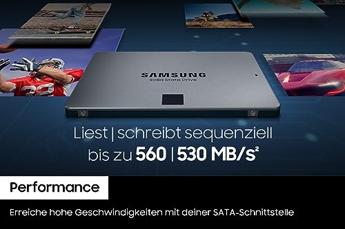 | Features | Solid State Drive (SSD) mit hoher Speicherkapazität für Alltagsanwendungen am PC oder Laptop, gut geeignet als Alternative zur HDD (Festplatte), Mehr Leistung, um schneller ans Ziel zu kommen: bis zu 3,6 Mal schneller als eine HDD (560 MB/s Lese-, 530 MB/s Schreibgeschwindigkeit), Schnelleres Hoch- und Herunterfahren, kurze Ladezeiten sowie schnelle Datenübertragungen können das Gefühl eines PCs vermitteln, Dank der Stoßfestigkeit der SSD sind Ihre Daten besser geschützt als auf einer HDD, Einfache Übertragung der Daten von Ihrer alten Festplatte auf die SSD dank kostenloser Samsung Data Migration Software – Magician |