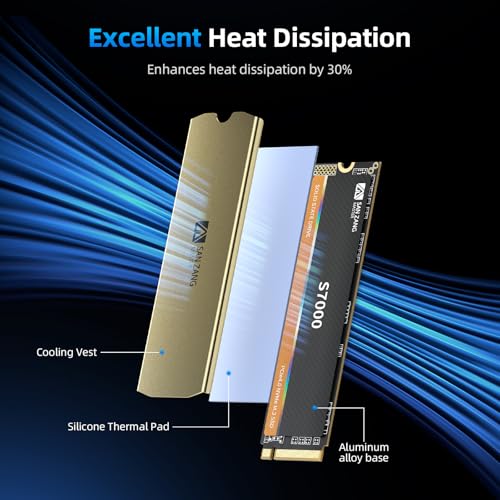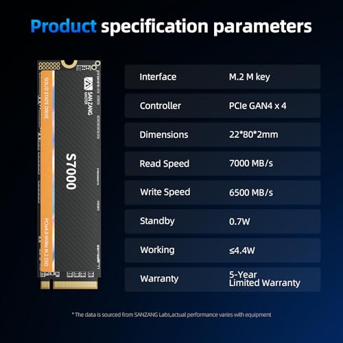 | Features | Ultimative Geschwindigkeit: PCIe 4.0 Gen4x4 Schnittstelle und NVMe Protokoll, S7000 M.2 2 TB SSD liefert Lese-/Schreibgeschwindigkeiten von bis zu 7000/6500 MB/s. Dies gewährleistet blitzschnelle Reaktionszeiten für Arbeit und Gaming und ist somit ideal für Hochleistungsbenutzer., Außergewöhnliche Zuverlässigkeit: Ausgestattet mit hochwertiger 3D NAND Technologie ist das NVMe SSD 2TB für Technikbegeisterte, Hardcore-Gamer und Profis konzipiert. Es bietet überragende Zuverlässigkeit und Haltbarkeit und gewährleistet eine stabile Leistung bei intensiver Computernutzung, hochauflösender Grafikverarbeitung und PC-Gaming., Hervorragende Wärmeableitung: Der Kühlkörper und die Silikonpads können die Effizienz der Wärmeableitung effektiv verbessern, die Anforderungen des Ausführens großer Anwendungen erfüllen und die Stabilität und Effizienz von Anwendungen mit hoher Ladung für lange Zeit sicherstellen., Perfekte Kompatibilität: Dieser 2TB SSD M.2 verfügt über einen kompakten M.2 2280 Formfaktor, der bei der Erreichung eines effizienten und leistungsstarken Systems unterstützt. Kompatibel mit PS5, Laptops, Desktops und PC. Achtung: Die Größe der Aluminiumschale dieses SSD ist nicht für PS5 geeignet. Wenn Sie es in PS5 verwenden, zerlegen Sie diese Aluminiumschale., Qualitätssicherung und Support: SAN ZANG MASTER S7000 SSD wird strengen Qualitätstests unterzogen, um sicherzustellen, dass jedes Detail hohen Standards entspricht. Für jede SSD gilt eine 5-Jahres Garantie und lebenslanger technischer Support, sodass Sie sich während der gesamten Nutzung beruhigt zurücklehnen können. |