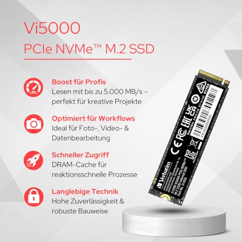 Die Verbatim Vi5000 NVMe M.2 Internal SSD ist eine ausgezeichnete Wahl für alle, die nach einer zuverlässigen und schnellen Speicherlösung suchen. Mit ihrer hohen Geschwindigkeit, Kompatibilität und Langlebigkeit eignet sie sich ideal sowohl für Gaming als auch für andere speicherintensive Anwendungen. Die einfache Installation und das gute Preis-Leistungs-Verhältnis machen sie zu einer praktischen Investition für Technikbegeisterte und Gamer gleichermaßen. Egal, ob du deinen PC aufpeppen oder deiner PlayStation 5 einen Speicherboost geben möchtest, die Vi5000 steht bereit, diese Anforderungen zu erfüllen und dir dabei zu helfen, ein optimiertes und reaktionsfähiges System zu genießen.