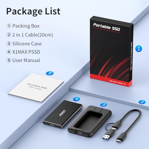 Die JOIOT Externe SSD 512GB ist ein tragbares Speichermedium, das sich ideal für alle eignet, die hohe Datenübertragungsgeschwindigkeiten und eine große Speicherkapazität benötigen. Mit einer soliden Bauweise und einem kompakten Design ist sie auf den schnellen, mobilen Einsatz ausgerichtet und bietet eine hervorragende Kompatibilität mit verschiedenen Geräten und Betriebssystemen.