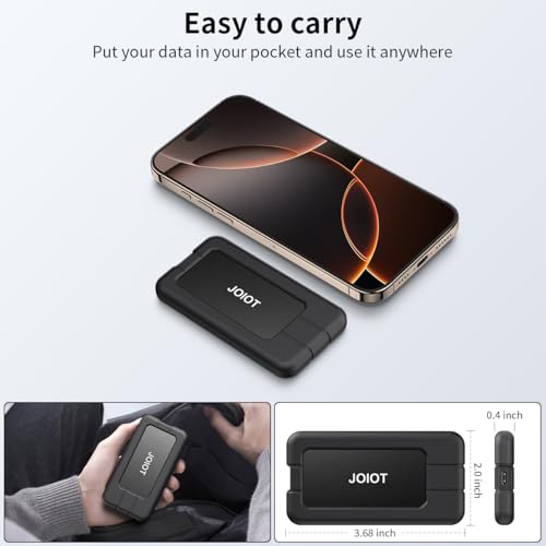 Dank ihrer kompakten Größe und des robusten Designs eignet sich die JOIOT SSD perfekt für den mobilen Einsatz. Sie passt problemlos in jede Tasche, sodass du sie jederzeit mitnehmen kannst. Auch das robuste Silikongehäuse bietet Schutz vor Stößen und ist ein wertvoller Begleiter auf Reisen oder in der Natur.
