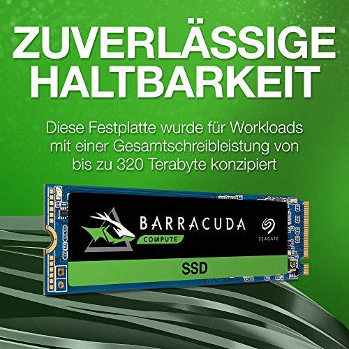 | Features | Beschleunigen Sie PC-Anwendungen und Multitasking mit rasanten Lese-/Schreibgeschwindigkeiten von bis zu 3.100/1.200 MB/s. Die BarraCuda 510 SSD verfügt über eine kompakte Bauform M.2 2280 und ist die ideale Speicherlösung für ultradünne und ultrakleine Laptops. Sie trägt durch die Reduzierung des Stromverbrauchs auch zur Verlängerung der Akkulaufzeit bei. Genießen Sie dauerhafte Zuverlässigkeit mit 1,8 Mio. Stunden MTBF und der im Lieferumfang enthaltenen beschränkten 5-Jahres-Garantie., Beschleunigen Sie Anwendungen für Desktop- und Laptop-PCs mit einem internen Halbleiterlaufwerk, das rasante Lese-/Schreibgeschwindigkeiten von bis zu 3.100/1.200 MB/s bietet, Verlängern Sie die Akkulaufzeit des Laptops mit den BarraCuda SSD-Laufwerken, die den Stromverbrauch reduzieren, Die kompakte Bauform M.2 2280 ist die ideale Speicherlösung für ultradünne und ultrakleine Laptops, Profitieren Sie von der Langzeit-Zuverlässigkeit von Barracuda mit 1,8 Mio. Stunden MTBF und 160 TBTBW |